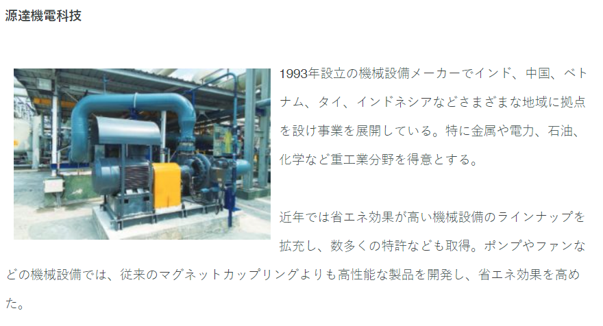1993年設立の機械設備メーカーでインド、中国、ベトナム、タイ、インドネシアなどさまざまな地域に拠点を設け事業を展開している。特に金属や電力、石油、化学など重工業分野を得意とする。