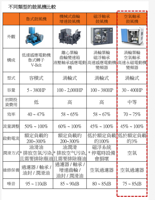 1.雖然魯氏鼓風機的單價較低, 但其運轉效率遠低於渦輪鼓風機, 以長期使用的觀點來看.電費才是最高的成本.