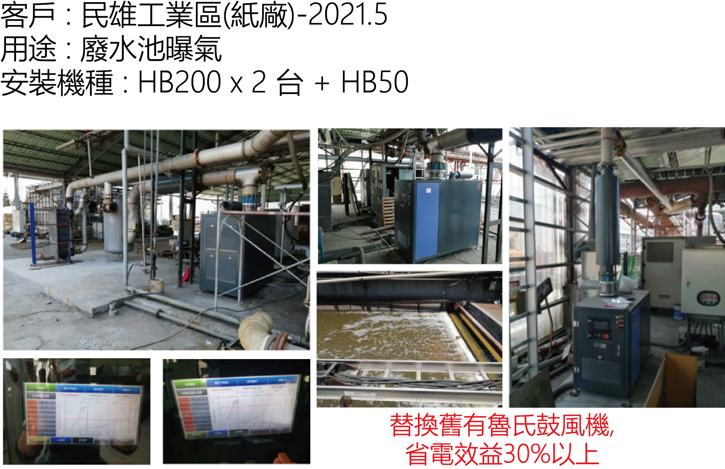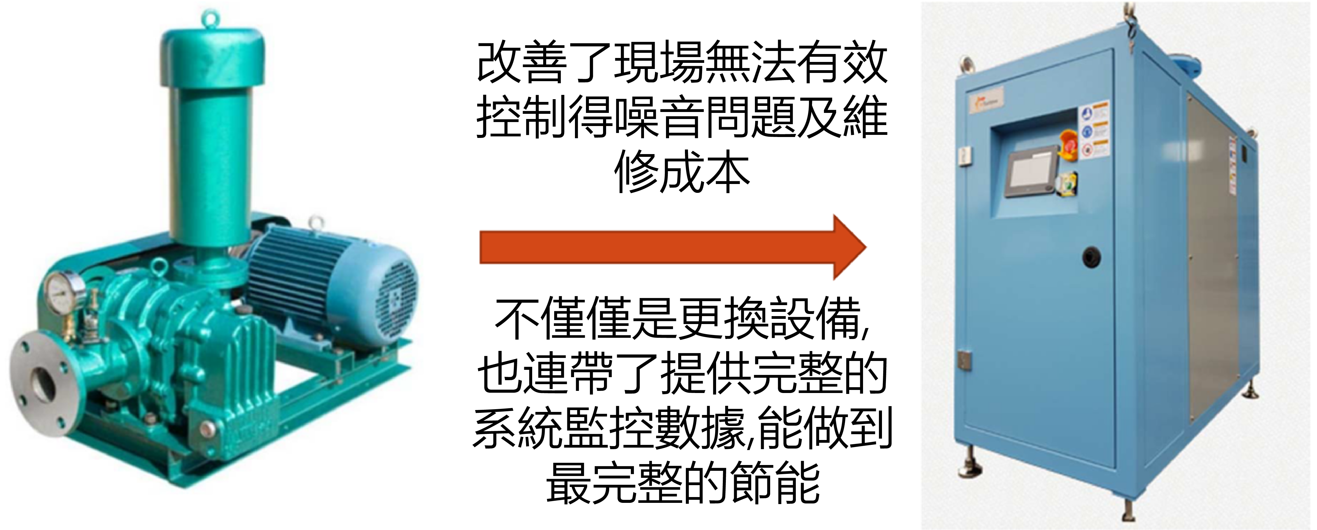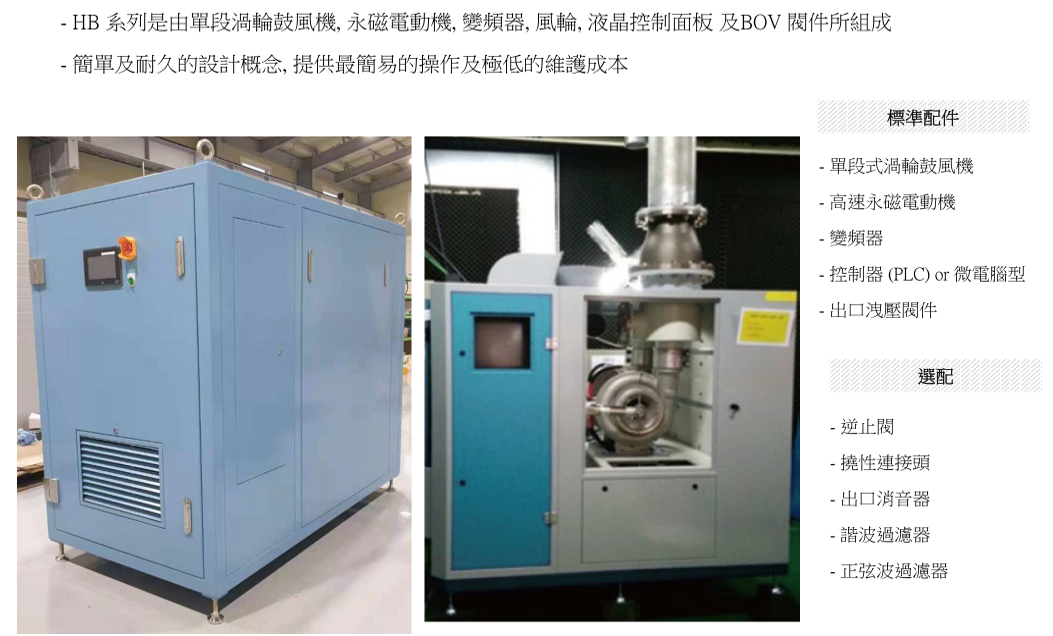 2.渦輪鼓風機的完整組件, 包含系統風量, 壓力, 耗電, 溫度的監控模組, 變頻運轉系統, 及有液晶控制面板, 可得到完整的操作資訊及節能優化調整. 所以能節省電費的, 不僅是風機效率所提供的25-35%, 還包含控制系統能帶來的額外10-30%的省電效益.